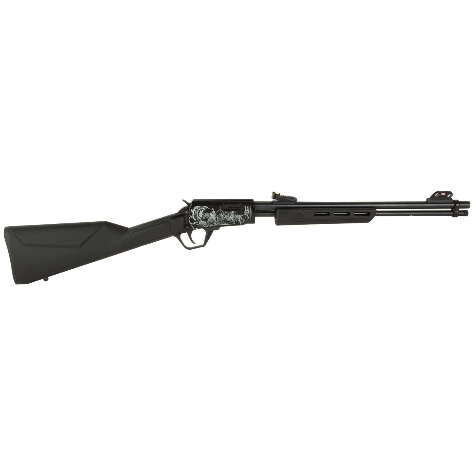 Rossi Gallery, Pump Action Rifle, 22 LR, 18″ Round Barrel, Matte Finish, Black, Synthetic Stock, Adjustable Sights, Black, Laser Engraved Turkey Receiver, 15 Rounds RP22181SY-EN10